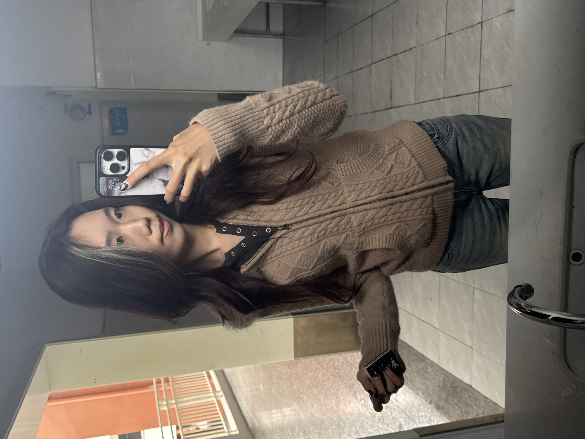 The scene is an indoor, tiled reflective space, likely a washroom or public facility, located in Longta, China. A female individual, appearing to be of East Asian descent, approximately in her late teens or early twenties, is depicted taking a mirror selfie. She has long, dark hair with a distinct light-colored streak on the right side. Her attire consists of a light brown, cable-knit, zippered cardigan worn over a dark shirt with metal snap buttons, and blue denim jeans. Her right hand, featuring a polished metallic silver thumbnail and dark-painted fingernails, holds a smartphone with a patterned case positioned to capture the reflection. Her left hand holds a small, dark, rectangular object with white text or design. A chrome sink faucet is visible in the immediate foreground, reflected in the mirror. The interior environment features light-colored square floor tiles and matching wall tiles. In the background, to the right of the subject, a white counter with multiple sinks is partially visible. To the left, an open doorway reveals an outdoor area with an orange building facade and white railings. The space is illuminated by overhead artificial light sources.