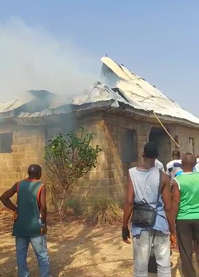 A video shows a single-story building with a corrugated metal roof that is partially destroyed by fire, with smoke emanating from it. The building is constructed of light-colored blocks. Several people are standing around the building, watching the fire. One person is throwing water on the roof with a blue bucket. The ground around the building is dirt, with sparse vegetation. The sky is light blue and mostly clear.