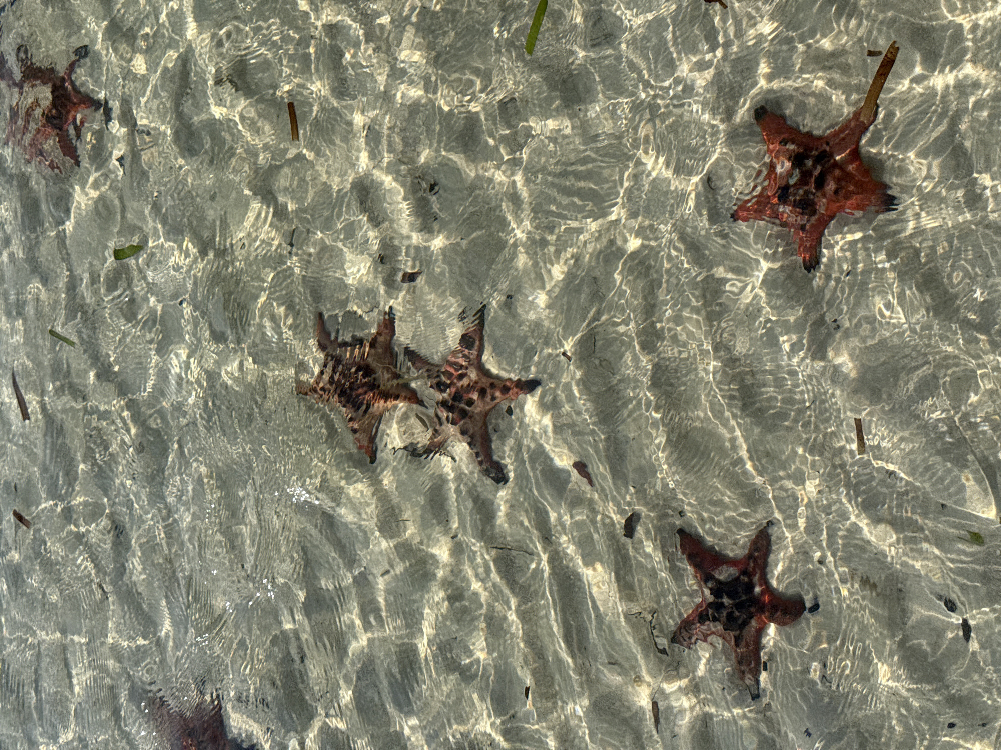 The image displays an underwater scene in shallow, clear water over a light sandy seabed, located in Phú Quốc, Vietnam. Five starfish, identified as Protoreaster nodosus (Chocolate Chip Sea Stars) due to their distinctive knobby, reddish-brown and dark coloration, are distributed across the sandy bottom. One starfish is in the upper right, two are centrally positioned, one in the lower left, and one in the lower right. Sunlight creates undulating patterns of light and shadow on the seabed, visible through the water's surface ripples. Small fragments of dark and green organic debris are scattered on the sand. No human presence or active interactions are observed.