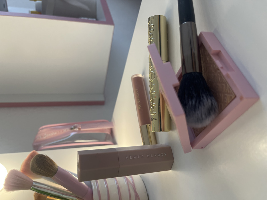 This image displays a collection of cosmetic products and application tools arranged on a white, flat surface, situated in Popovo, Bulgaria. In the immediate foreground, a light-pink compact is open, revealing a pan of textured, brown-toned pressed powder, likely a bronzer or highlighter. A dark-bristled makeup brush, fading to grey at the tips, rests horizontally within this open compact. Behind the compact, a gold-colored cylindrical tube labeled "L'ORÉAL PANORAMA" lies horizontally. Adjacent to it, a nude-pink tube with a gold cap, marked "NL BEAUTY," is also positioned horizontally. Further to the left, a light-mauve, hexagonal tube inscribed with "FENTY BEAUTY" stands upright. To the far left, a white ceramic cup with pink horizontal stripes contains an assortment of several makeup brushes, some with pink handles and varying bristle colors including pink and brown. The background features a mirror with a pink frame, reflecting indistinct white and yellow objects, and a bright, circular light source is visible in the upper left corner of the frame. No individuals are present in the scene.