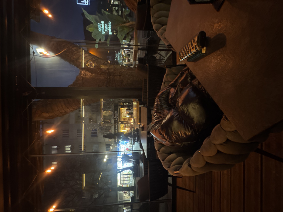 - "The image depicts the interior of a dimly lit establishment, likely a cafe or restaurant, looking out through large glass windows onto a city street at night in Varna, Bulgaria" by FM-NhD9Z2, licensed under CC BY 4.0