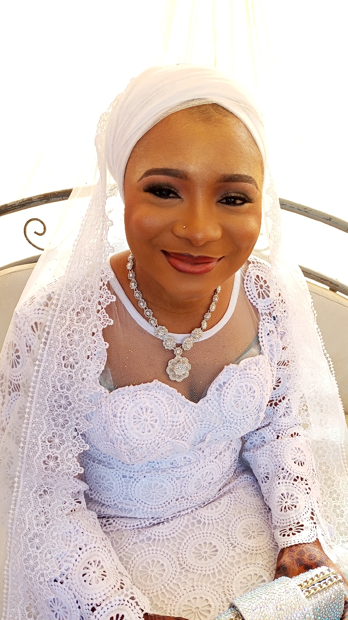 An adult female is depicted in a head-and-torso portrait, smiling and looking directly at the camera. She wears a white turban-style headwrap with a sheer white lace veil, intricately patterned. Her attire consists of a long-sleeved, white garment constructed from a patterned lace fabric with circular motifs, featuring a sheer mesh section over the upper chest. A prominent silver-toned necklace with a large, ornate floral pendant adorns her neck. A sparkling, multi-row bracelet with gold-toned accents is visible on her right wrist, which also displays dark, patterned designs consistent with henna. Her face is made up, with defined eyebrows, dark eye makeup, and light-colored lipstick. A small metallic stud is present on the right side of her nose. The background is largely bright white, with hints of a light-colored upholstered surface and a dark, curved metallic object, suggesting an indoor or sheltered outdoor setting. The specific location within Afaka, Nigeria, is not discernable from the visual evidence.