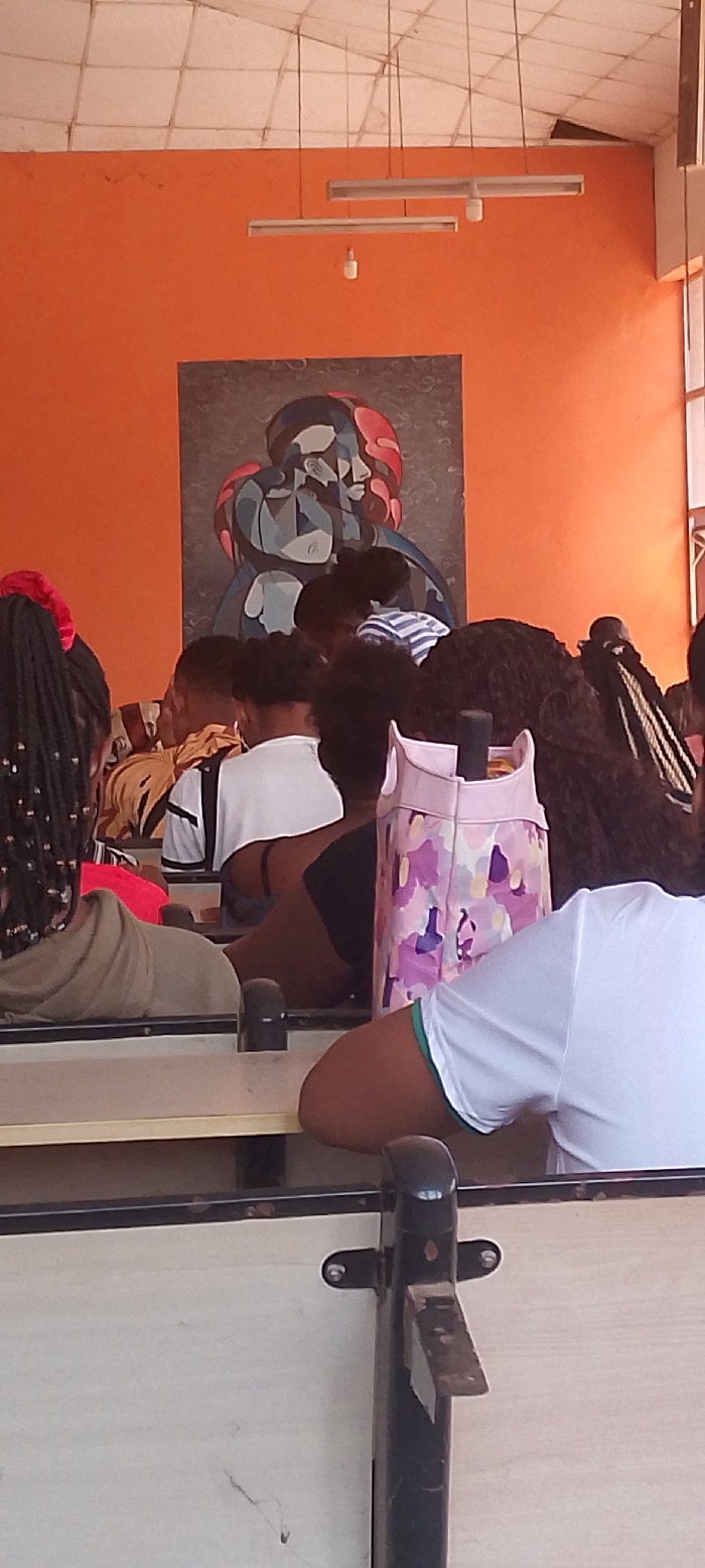 The image displays an interior view of a lecture hall or classroom, located within the University of Nigeria, Nsukka, Nigeria. The room features a dominant orange wall, adorned with a large, vertically oriented abstract cubist painting depicting two intertwined figures in shades of blue, grey, and red. The ceiling consists of light-colored, grid-patterned acoustic tiles. Multiple suspended fluorescent light fixtures are visible, with two main units each having an additional small pendant bulb hanging below. Approximately ten individuals, predominantly young adults, are observed seated at individual desks with attached chairs, arranged in rows. Most subjects are viewed from the back or side, with their heads generally lowered, suggesting engagement in a class or study activity. Visible details include diverse hairstyles such as braids and natural hair. Attire includes a white t-shirt with green trim on the right forearm, a white shirt with black horizontal stripes, and a red headscarf. A light pink tote bag with a multi-colored abstract pattern is positioned on a desk in the mid-ground. The desks feature light-colored surfaces and dark metal frames. A vertical white architectural element, possibly part of a window or doorway, is visible on the far right edge of the frame.