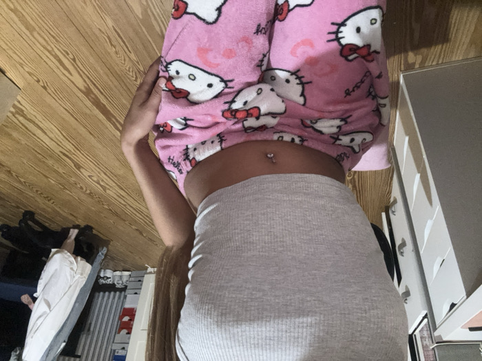 The image displays an indoor scene, primarily focusing on the mid-torso to upper thighs of an individual. The person is seated on a small pink cushion, wearing a light grey ribbed crop top that exposes the navel, which features a silver-colored barbell piercing. They are also wearing pink pajama bottoms patterned with multiple white Hello Kitty characters, each adorned with a red or pink bow. The individual's left arm is visible, resting on their left thigh. The flooring consists of light-toned wooden planks with visible grain. In the background to the left, a white multi-drawer dresser or cabinet with silver handles is partially visible. To the right background, a portion of a blue chair, several draped garments, and a dark rolling chair base are present. A pair of white sneakers and various storage containers are visible on the floor and shelves further in the background. The exact location within the city of Erstein, France, cannot be determined from the visual information presented.