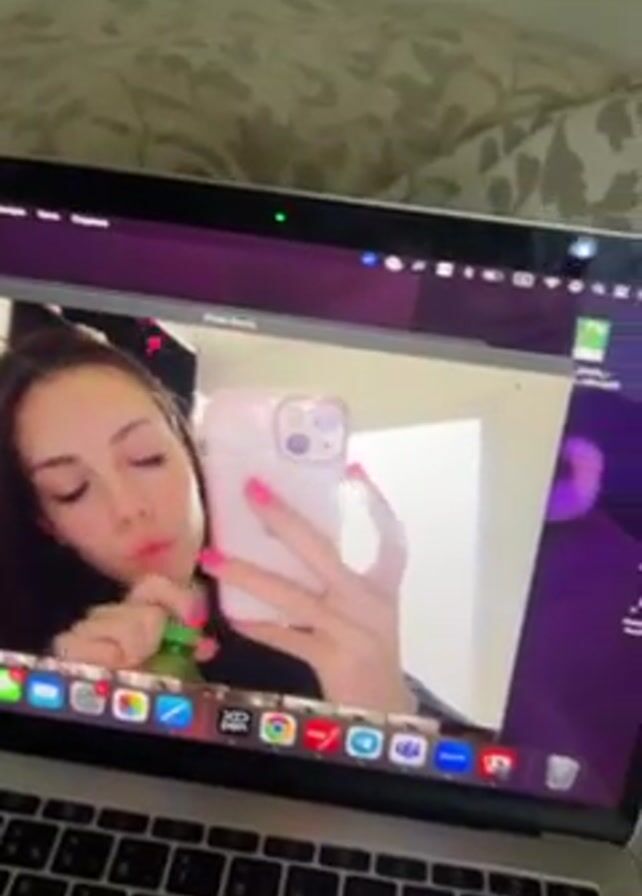 Here's a detailed description of the video: A laptop sits open on a bed. The screen displays the Photo Booth application with a selfie of a young woman. She has long dark hair, pink nails, and is holding up a light pink iPhone to take the picture. She's drinking from a green-labeled bottle. The Photo Booth application also has heart-shaped graphics around the woman's head in the display. The laptop's trackpad and keyboard are visible, along with various icons on the desktop screen to the right. The bed has a patterned beige and gray pillow beneath the laptop. The lighting in the scene suggests an indoor environment.