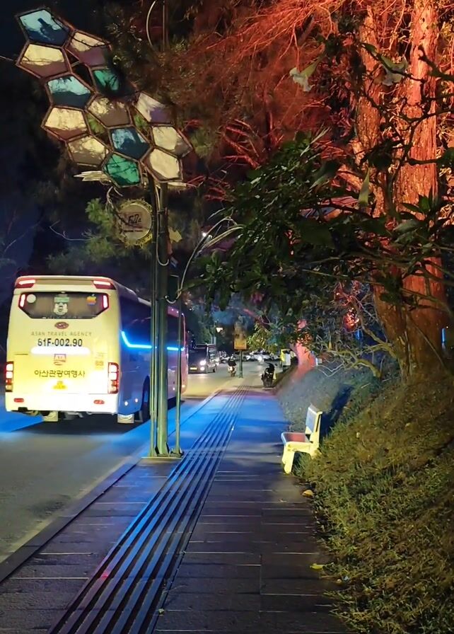 At night, a roadside scene unfolds with a yellow bus moving slowly along the road to the left. The sidewalk is paved with grey stone, its surface marked with a regular pattern of raised ridges for accessibility. A street light with a unique, geometric shade composed of multicolored panels illuminates the scene. A small white bench sits on the edge of a grassy embankment to the right. Large trees overhang the sidewalk and embankment, their branches lit with red and orange light. Cars and motorcycles can be seen on the road beyond the bus. The scene is still.