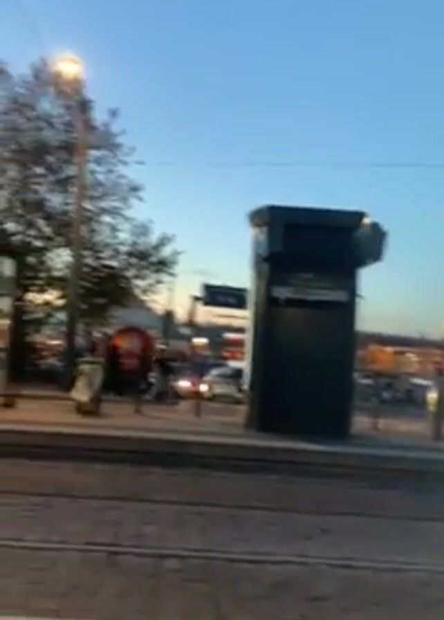 The camera is stationary at a tram stop in what appears to be a city. The sky is a dusk blue. There are people visible in the background and along the tram stop. The tram stop itself has a shelter and a ticket kiosk. Cars are driving on the road in the background.