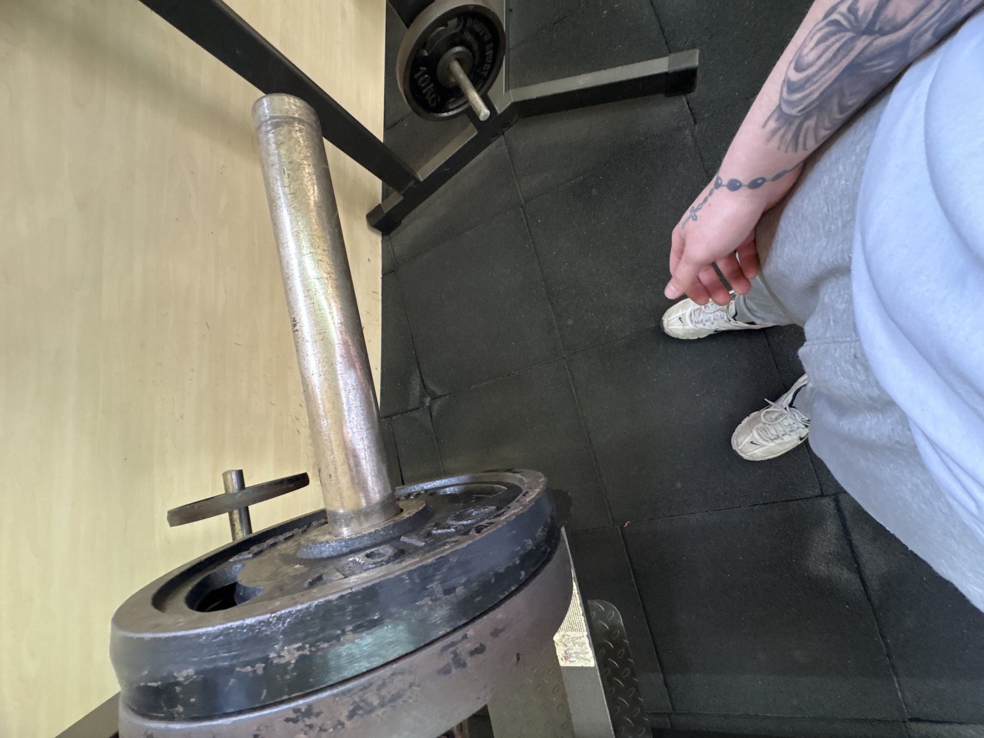 The image displays an indoor gym environment in the city of Goce Delcev, Bulgaria, viewed from a first-person, downward-angled perspective. A metallic barbell, loaded with multiple dark, worn circular weight plates secured by a collar, extends horizontally across the upper left and center of the frame. The barbell rests on a black metal weightlifting rack, a portion of which is visible on the right. The floor is covered with dark, interlocking rubber gym mats. In the foreground, the lower torso, legs, and left arm of an individual are present. The person wears light grey sweatpants, white athletic shoes, and a light-colored sweatshirt. The visible left forearm and hand feature multiple dark, monochrome tattoos, including a rosary-like design on the wrist and an intricate, abstract design covering the forearm. In the lower right, an additional 10KG weight plate is discernible on or near the base of the weightlifting rack. A light-colored, possibly wooden wall forms the background.