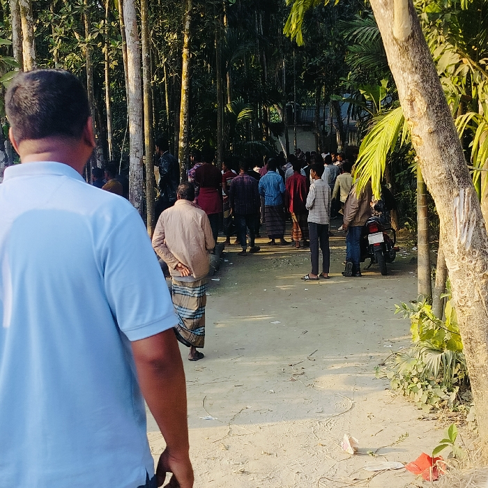 The scene depicts an outdoor gathering of approximately 15-20 adult male subjects on an unpaved dirt path within an unknown rural or semi-rural setting. In the immediate foreground, a male subject is visible from the back, wearing a light blue short-sleeved polo shirt, positioned on the left. The dirt path, light brown in color, occupies the lower portion of the frame and contains scattered debris including a white crumpled item and a red plastic object on the right side. Further down the path, a group of male subjects is observed. One male subject, seen from the back in the mid-left, wears a light brown jacket and a brown, light blue, and white checkered lungi, with his hands clasped behind his back. The larger group is comprised of men wearing various casual garments including shirts (some plaid), t-shirts, and several lungis, in colors such as blue, red, brown, and white. The individuals appear to be standing and observing the area further down the path. A black motorcycle with a white rear fender is parked on the right side of the path, behind some of the subjects. The environment is heavily vegetated with numerous tall, slender trees, likely palms, lining both sides of the path and extending into the background, forming a dense canopy. Glimpses of structures are faintly visible through the foliage in the far background. The scene is illuminated by natural sunlight, indicating daytime conditions.