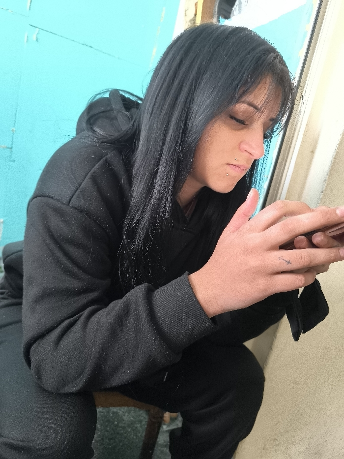 A female individual is seated indoors, focusing on a smartphone held horizontally with both hands. She has long, straight, dark hair, and a labret piercing with two small studs below her lower lip. A small black stylized sword tattoo is present on the back of her right hand, between the index and middle finger knuckles. She wears a black hooded sweatshirt with ribbed cuffs and black sweatpants, both showing minor fabric pilling. Her left arm rests on her thigh, and her gaze is directed downwards at the phone. The immediate background to her left is a textured, light blue wall. To her right, a vertical light-colored frame, possibly part of a window or doorway, is visible. Below, a portion of a wooden stool or chair leg is discernible. The specific location within the city of Panichishte, Bulgaria, cannot be determined from the visual information provided.