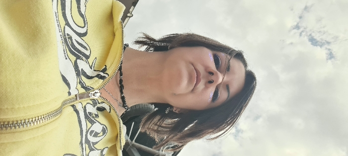 A low-angle portrait depicts a female individual in the Mate Asher Regional Council, Israel. The subject has short, dark brown hair, with strands appearing disheveled or windblown across her forehead. Her face is directed towards the camera, displaying a neutral expression. She exhibits purple glitter eye makeup on her eyelids and a visible streak, possibly a tear, descending from her left eye onto her cheek. A septum piercing is present in her nose. She wears multiple earrings, including a star-shaped earring on her right ear, a black beaded choker necklace, and a silver pendant necklace visible beneath. She is dressed in a yellow zip-up hooded sweatshirt with a partially unzipped metallic zipper. A dark graphic design featuring text, including "ORIGINAL SPORTSWEAR" and "AUTHENTIC SPORTSWEAR," is visible on the left chest area of the sweatshirt. The background consists of a cloudy sky with scattered patches of blue visible. A dark, indistinct object, possibly a vehicle tire or part of a structure, is partially visible on the right side of the frame.