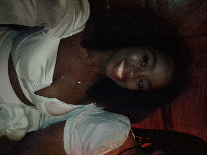 A woman smiles at the camera, wearing a white, low-cut top. She has dark hair and wears bright red lipstick. A thin, silver necklace adorns her neck. The lighting is dim, and the background is a mix of dark shadows and a reddish hue.