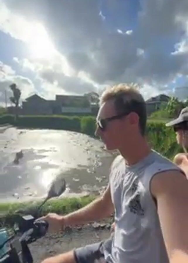 A man wearing sunglasses and a tank top is riding a scooter along a muddy path next to a flooded field. A woman wearing a baseball cap is seated behind him on the scooter. The sun is shining behind them through the clouds. There are buildings and greenery visible in the background.