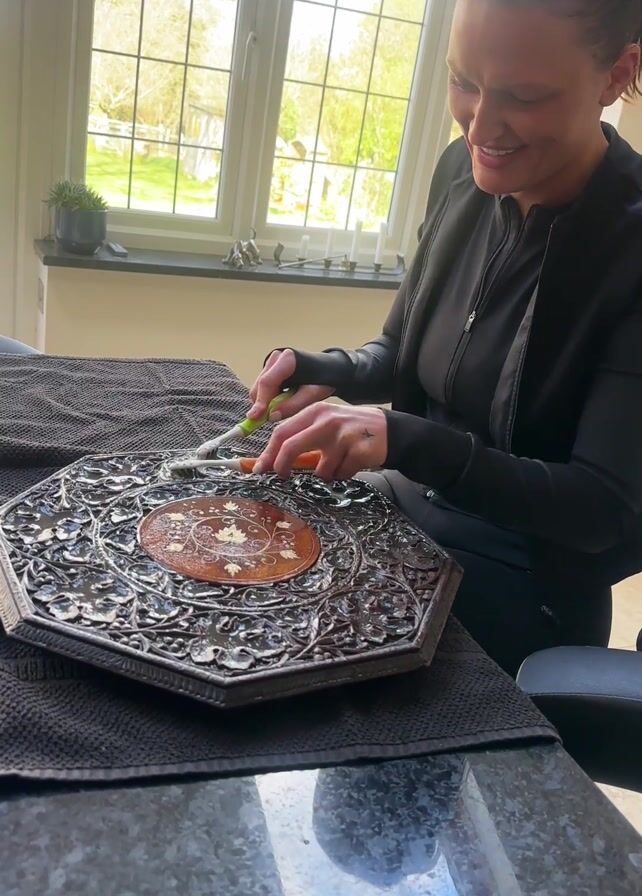 A woman in a black zippered jacket is sitting at a dark marble table and smiling. She is cleaning an octagonal decorative item with two toothbrushes. The decorative item has a circular center of brown wood with inlaid mother-of-pearl designs, and an ornate silver metal border with intricate carved details. The item sits on a gray towel. A large window behind the woman shows a green lawn and trees. There are candles and a small potted plant on the windowsill.