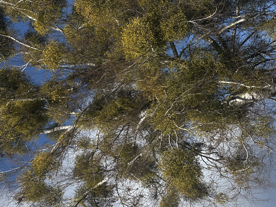 The scene depicts the upper canopy of a birch tree (Betula sp.) in Hrodna, Belarus, heavily infested with mistletoe (Viscum album). Numerous dense, yellowish-green clusters of mistletoe foliage are distributed among the bare, light-colored branches of the host tree. Gaps in the branches and mistletoe clusters reveal a clear blue sky with scattered white clouds, particularly visible in the upper left portion of the frame. The perspective is upward-looking, encompassing the tree's structure against the sky. No individuals, animals, or anthropogenic objects are present within the frame.