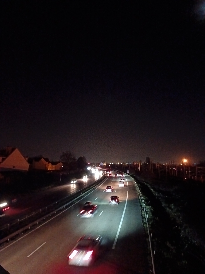 A nighttime view of a highway with moving cars, illuminated by their headlights. Houses and trees line the left side of the road, and a line of light posts is visible on the right. The sky is dark, with a hazy glow near the horizon. The road markings and barriers are visible, defining the lanes and edges of the highway.
