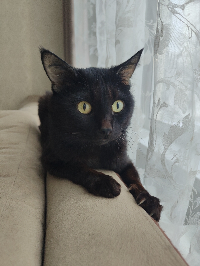 - "A sleek, black cat with vibrant yellow-green eyes perches on a tan, cushioned surface, possibly a sofa or bed" by FM-o6dT83, licensed under CC BY 4.0