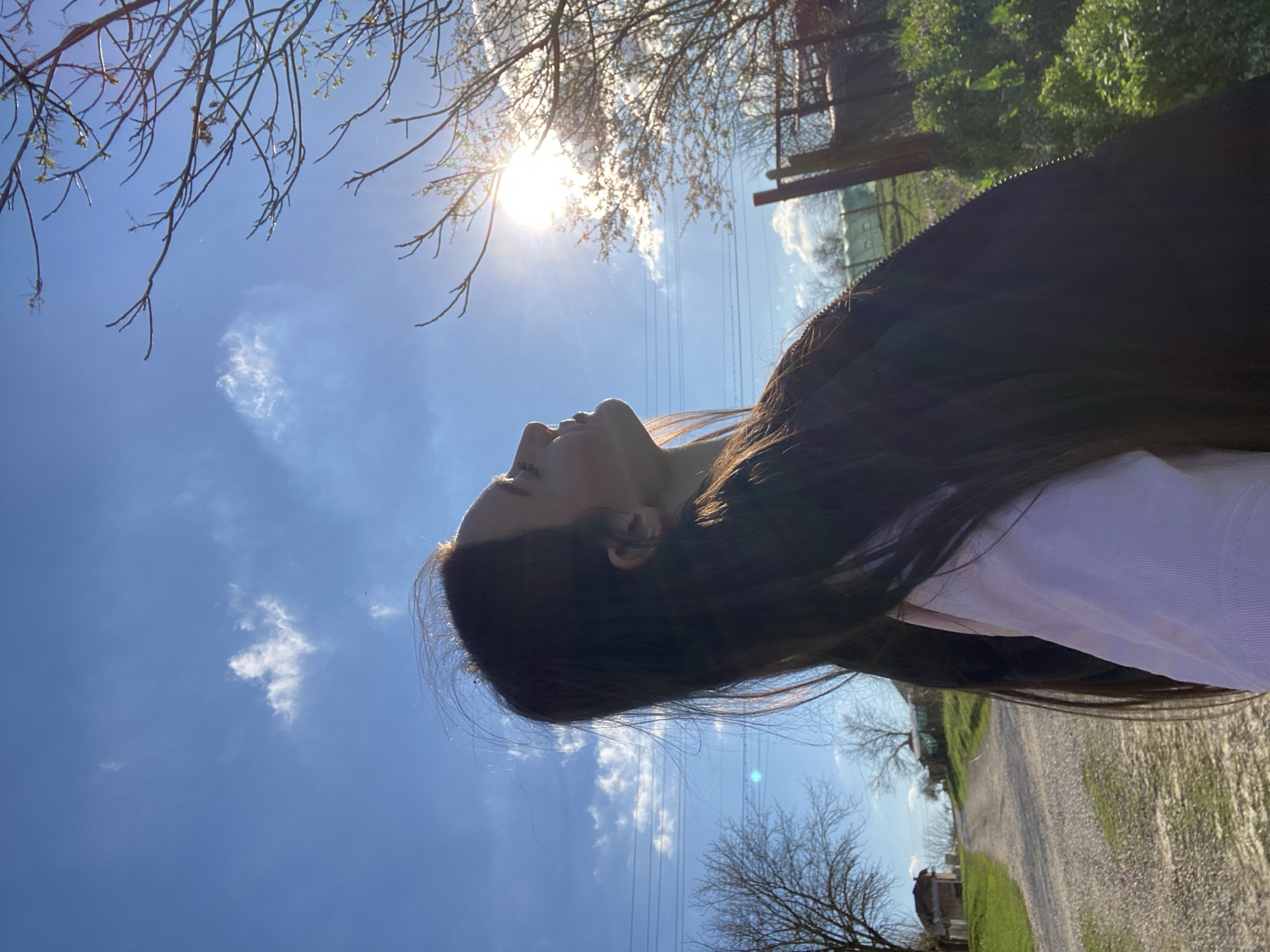 A woman with long brown hair stands on a dirt path under a bright blue sky with scattered clouds and a prominent sun. Her head is tilted back, face oriented toward the sun. She wears a white shirt and a dark jacket. Bare branches of a tree are visible in the upper left. Utility poles and lines are in the background. On the right is a green field and a dirt path. The location cannot be confirmed with only the picture provided.