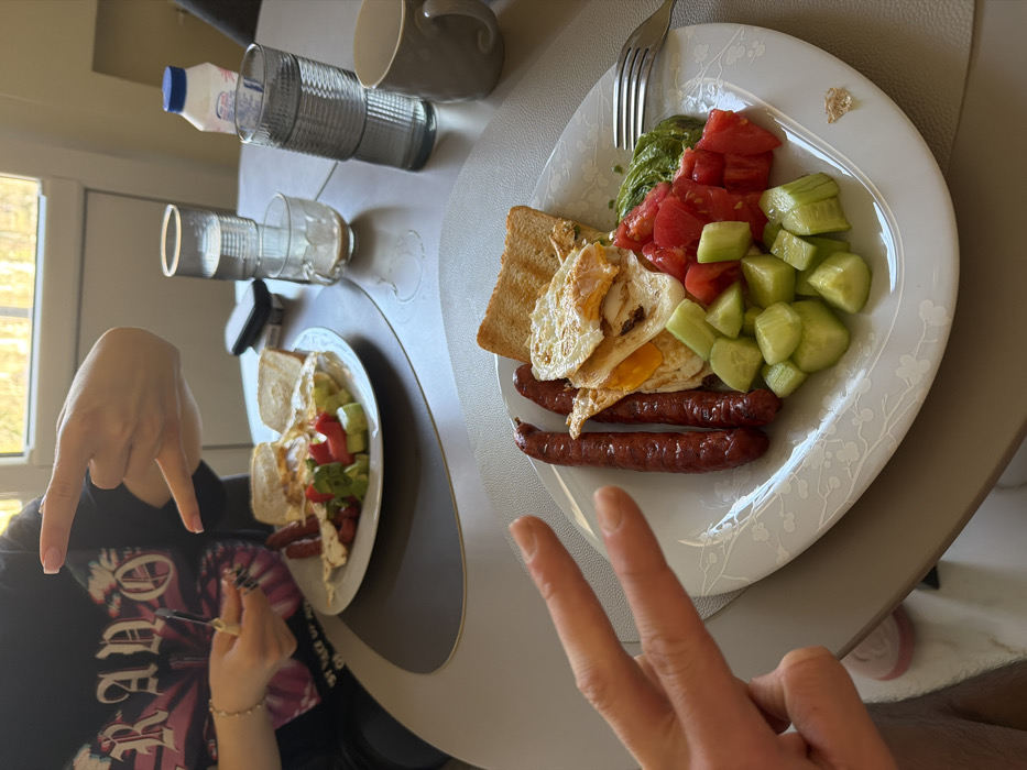 The scene depicts an indoor dining area in Pernik, Bulgaria, featuring a light gray table with two individuals seated. In the foreground, a person's left hand displays a "peace" sign. This individual's lower body is visible, including a dark garment and a pink slipper peeking from under the table. On the table directly in front of this individual is a white oval plate containing two grilled sausages, three fried eggs, two pieces of toasted bread, diced tomatoes, and diced cucumbers. A silver fork rests on the right side of the plate. In the background, a second person is partially visible, wearing a black t-shirt with a pink and white graphic print. Their right hand performs a "rock and roll" gesture, and their left hand holds a yellow lighter. This individual also has a white oval plate containing sausages, fried eggs, toasted bread, and diced vegetables. Adjacent to their plate are a black smartphone and a partially visible pack of cigarettes, likely "LM" brand. Various beverages are distributed across the table: two tall clear glasses of water, a small clear glass containing a residue, a gray ceramic mug, and a white plastic bottle with a blue cap, identifiable as a Harmonica brand dairy product. A window in the background reveals blurred outdoor foliage. The table is adorned with two dark gray oval placemats.