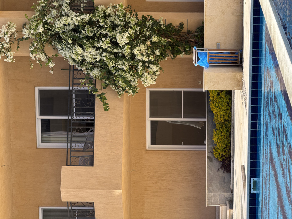 The scene depicts a section of a multi-story building in Al Ahia', Egypt, under bright daylight. The building's facade is a uniform light orange with a textured stucco finish. On the upper level, a balcony with black wrought-iron railings extends from the left. Two dark-colored chairs are visible on the balcony through the railing. Sliding glass doors with white frames provide access to this balcony, with another similar set partially visible to the left. A large, dense bougainvillea plant with numerous white flowers and green leaves climbs vertically along the right side of the building, spanning from the ground level to above the upper balcony. On the lower level of the building, another set of sliding glass doors with white frames is present. The left pane of these doors appears partially open, revealing a light-colored curtain hanging inside. Below these doors, a raised planter box contains vibrant green and some reddish-purple shrubbery. In the foreground, a swimming pool occupies the lower portion of the image. The pool features blue and dark blue tiles along its edge, and the water surface is rippled, reflecting ambient light. Darker lane lines are faintly visible at the bottom of the pool. Adjacent to the pool on a paved patio, a light-colored, possibly wooden, waste receptacle with a blue plastic bag draped over its top and lining its interior stands to the right of the lower doors. No individuals, actions, or direct interactions are visible within the frame.