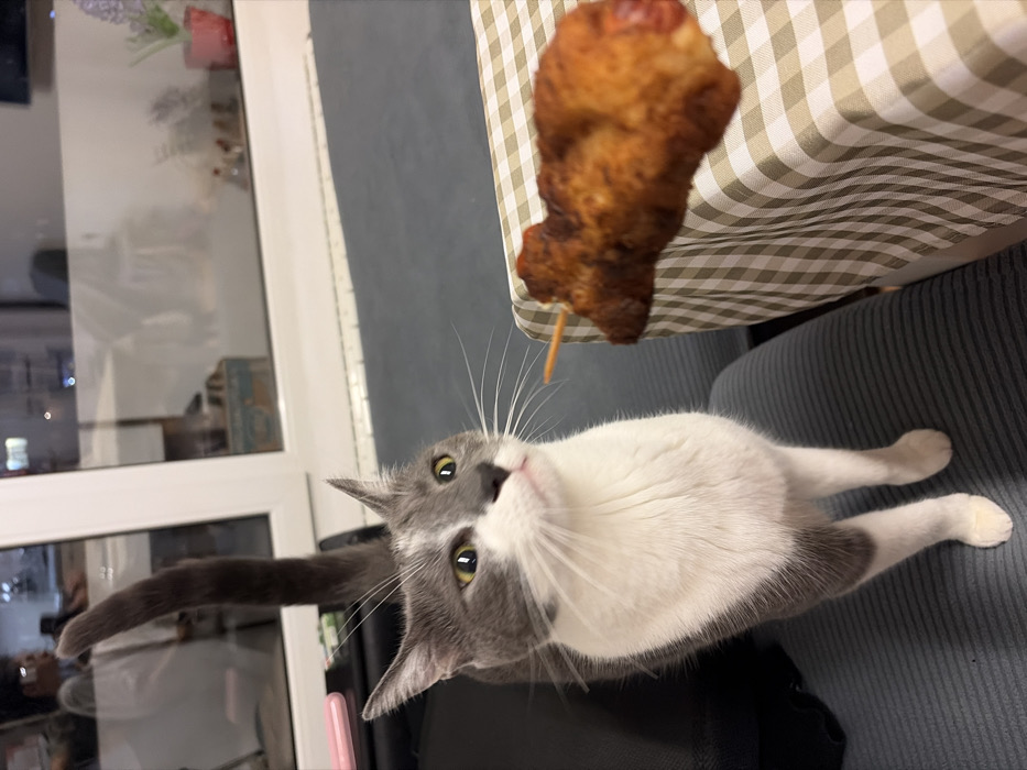 The image depicts an indoor scene at night. While the request specifies Sofia, Bulgaria, no distinctive landmarks or unique architectural features are visible to pinpoint a precise location within the city, beyond a general urban environment indicated by blurred lights through a window. A domestic shorthair cat, characterized by grey fur on its head, back, and tail, and white fur on its chest, belly, and paws, stands upright on a dark grey upholstered surface. Its yellow eyes are fixated on a deep-fried, oblong food item, possibly a battered sausage or corn dog, which is presented on a thin wooden skewer to the cat's right, held at approximately its eye level. The cat's tail is held erect, indicating attentiveness. To the right of the cat, a table is covered with a light brown and white checkered tablecloth. The background features a large window or glass door, through which the blurred illumination of an urban exterior at night is visible. Reflections on the glass reveal partial interior elements, including the upper torso of a person and a plant in a red pot.