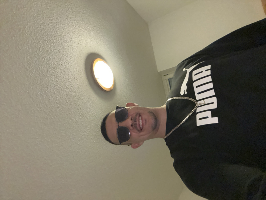 A man in black sunglasses and a black Puma sweatshirt smiles at the camera. He wears a silver chain necklace. The picture is taken from below, looking up at the man, against a beige wall with a round, illuminated light fixture. A window is partially visible in the background. The image is slightly tilted.