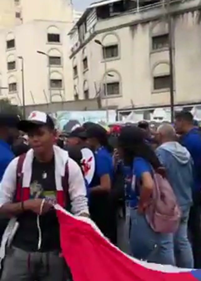 crowded street in what appears to be a city. The crowd is marching and carrying large Venezuelan flags. Many people are wearing clothing with the colors of the flag and small flags are also visible. There are tall buildings lining the street and the weather appears to be overcast. In the background, a large stage is visible. Many people are looking at their phones or taking photos/videos.