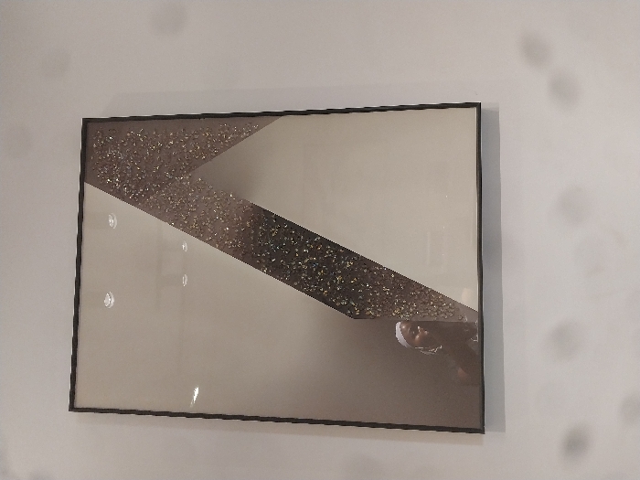 The image depicts a rectangular framed artwork hanging vertically on a plain white wall within an indoor environment. The frame is dark. The artwork itself is highly reflective, featuring a geometric pattern. The main body consists of two large, smooth, light-colored (off-white/beige) reflective panels, occupying the top-left and bottom-right areas. A wide, dark diagonal band, textured with numerous small, sparkling, granular elements, traverses the artwork from the top-right corner to the lower-left. A thinner, solid dark diagonal line is also visible within the top-left light-colored panel. Reflected within the artwork's upper half are multiple circular ceiling lights. In the lower-left portion of the artwork, the reflection of an individual is visible. This person has dark skin, wears a light-colored head covering, dark upper attire, and prominent earrings. They appear to be positioned facing the artwork or the camera. The white wall surrounding the artwork exhibits several faint, blurry, dark circular smudges, particularly below and to the right of the frame. The scene is an interior space; however, the image provides no specific visual information or identifiers to confirm its location as the city of Bauchi, Nigeria.