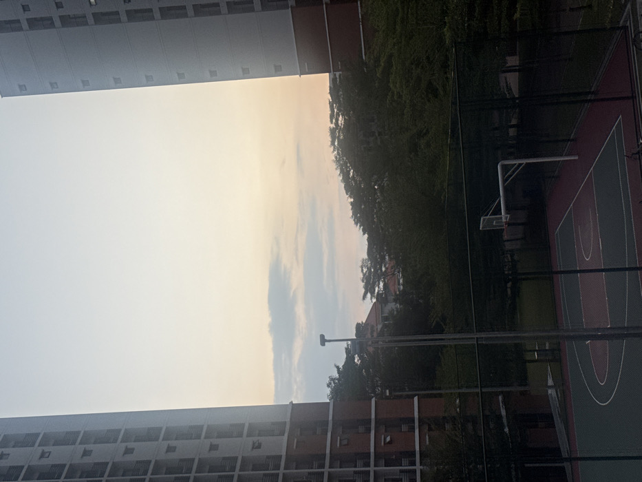 A basketball court sits adjacent to a building, surrounded by trees. The court's surface is divided into sections of green and red. A basketball hoop and pole stand at one end. Tall, multi-story buildings flank the scene, with a soft, hazy sky visible in the background. The image is slightly rotated, with the top of the frame leaning towards the left.