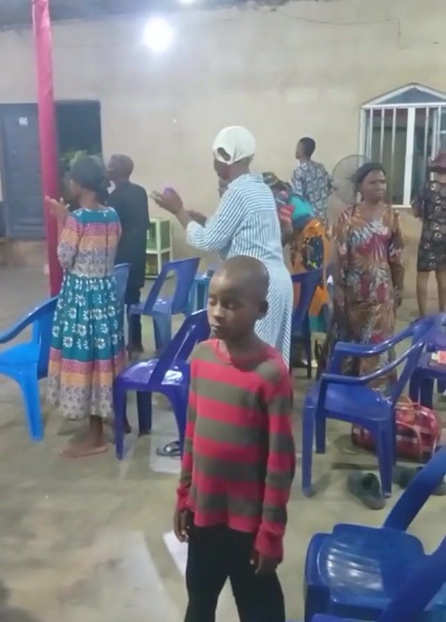 The scene is a room where some people are standing and clapping, seemingly in a church or a gathering of some kind. There's a boy in the foreground, wearing a red and green striped shirt and black pants, looking towards the camera. Several blue plastic chairs are scattered around the room. Some of the adults in the background are wearing patterned dresses, and one woman has a white head covering. There's a red pole wrapped in fabric, a window, and a small shelf visible in the background. The lighting is somewhat dim, provided by a single light hanging from the ceiling. The floor is concrete.