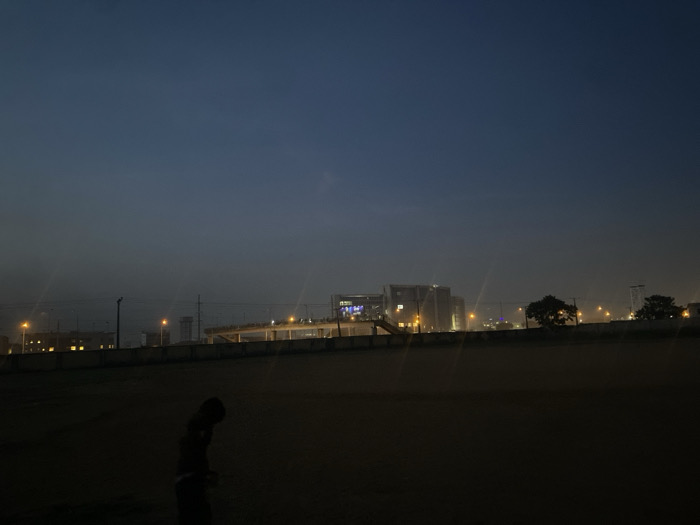 A dimly lit cityscape at dusk reveals buildings and a bridge illuminated by sparse streetlights. The sky transitions from a deep blue to a lighter gray haze near the horizon. A silhouette of a person is visible in the lower left corner, standing on what appears to be a dark, flat ground. The overall atmosphere is somber and still.