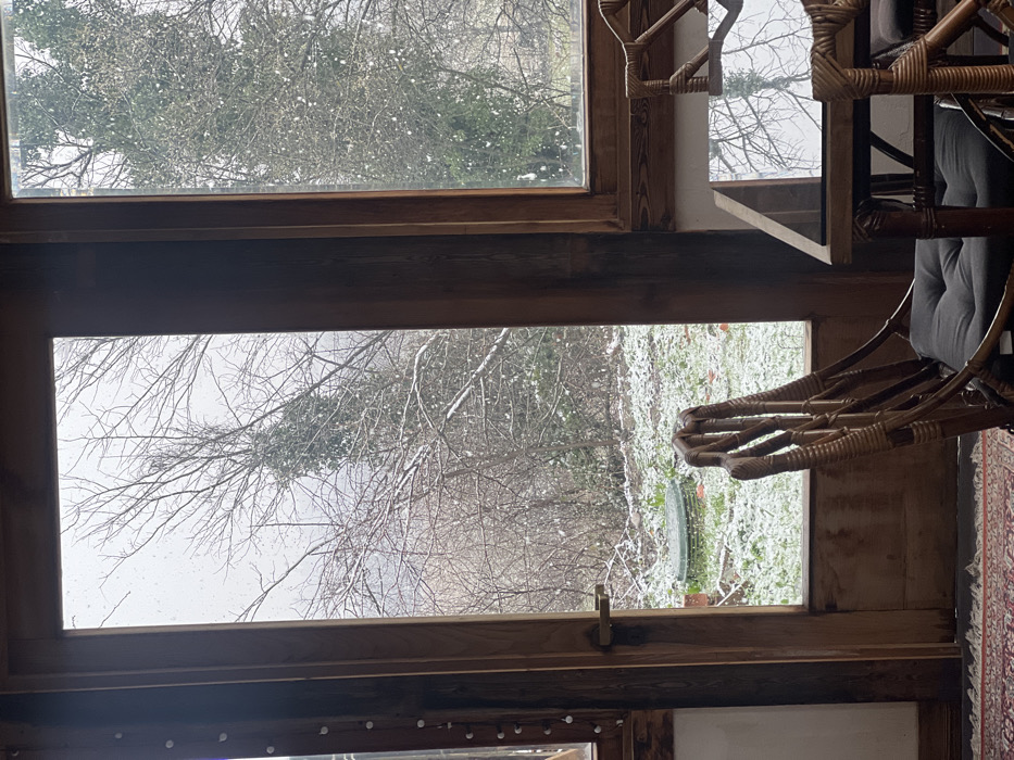The image depicts an indoor scene looking out through a set of glass-paned wooden French doors and an adjacent window during a snowfall in the city of Argveta, Georgia. In the foreground and midground, a section of a patterned red and cream rug is visible on the floor. To the right, a dark brown wicker-style chair with a dark grey cushioned seat is positioned at a table with a reflective, dark surface, which mirrors the snowy outdoor view. A second, similar wicker chair is partially visible on the left. The wooden door frame on the left features a brass-colored doorknob and a vertical string of small, white decorative lights. Outside, a light layer of snow covers the ground, intermingled with visible green grass. Snowflakes are actively falling, evident against the hazy, overcast sky. The landscape consists of numerous bare deciduous trees and shrubs, many with a light dusting of snow on their branches. A tree on the right side of the frame is heavily covered in green evergreen foliage, possibly ivy. In the outdoor midground, a circular, dark green or grey cover is present on the snowy ground. The terrain beyond the immediate foreground appears to slope downwards, suggesting a hilly or mountainous environment. No people are visible in the scene.