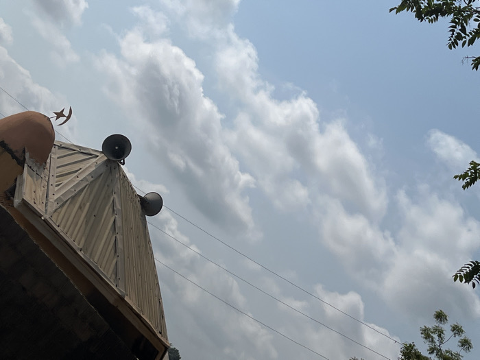 This image, captured in Idah, Nigeria, presents a view of a building's upper section against a partially cloudy sky. The primary subject is a structure, likely a mosque, constructed with light-colored, possibly weathered, corrugated metal panels. An orange-brown, domed architectural feature is visible on the far left, surmounted by a metal finial depicting a crescent moon and a star. Two dark, horn-shaped loudspeakers are mounted on the corrugated structure, positioned to face outwards and slightly upwards. The sky is pale blue with numerous white cumulus clouds. Several thin, dark overhead wires traverse the mid-left section of the frame. Green tree foliage is visible in the upper right and lower right corners. No individuals are present in the scene.