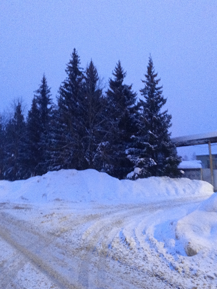 This image depicts a snow-laden winter landscape in Красный Маяк, Russia, under low, diffused light conditions, giving the scene a cool blue cast. The foreground features a snow-packed road, showing clear tire tracks in the dirty, churned snow as it curves sharply to the right. Significant snowbanks line both sides of the road, particularly prominent on the left. In the midground, a dense grouping of dark evergreen trees, primarily spruces or firs, stand tall, heavily dusted with snow on their branches, creating a sharp contrast against the pale sky. The background on the right reveals glimpses of man-made structures: a multi-post supported overhead canopy or walkway, partially covered in snow, and a smaller, snow-covered building or shed beneath it. No people, animals, or explicit actions are visible within the scene, which appears quiet and undisturbed save for the vehicle tracks on the road.