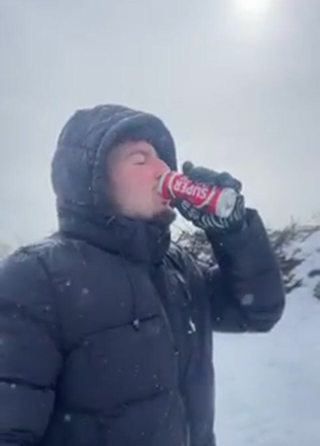 Here is a brief description of the video: The video shows a person in a snowy environment. The individual, wearing a black puffer jacket with a hood and gloves, drinks from a red and white can labeled "SUPER." The sun shines weakly through a cloudy sky. After taking a sip, the person turns away from the camera and walks a short distance up a snow-covered slope, which leads to a view of a valley shrouded in fog. A few sparse bushes are visible in the foreground. The scene is overcast with light snow falling.