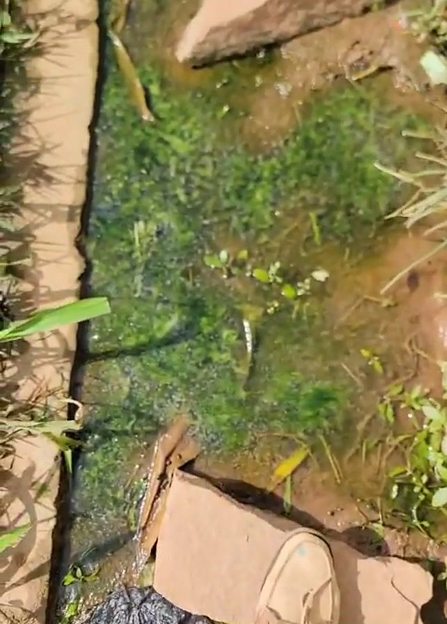 A person wearing black pants and beige shoes crosses a shallow, narrow stream. The stream is bordered by concrete edges, stones, and grassy areas. The stream bed contains algae and debris including a black plastic bag and empty blister packs of pills. The person steps on stones within the stream to cross.