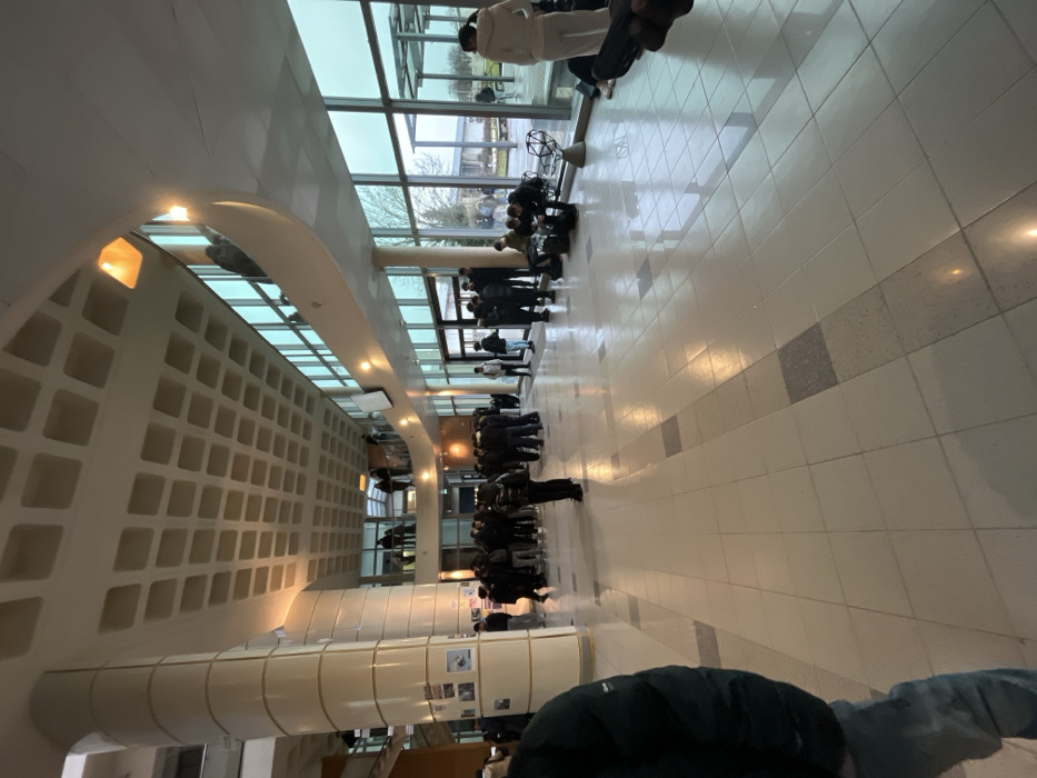 The image depicts the interior of the Pôle API (Applications, Procédés, Innovation) building at INSA Strasbourg, located in Illkirch-Graffenstaden, a commune within the Strasbourg Eurometropole, France. The scene is a large, multi-level modern atrium featuring a high, light-colored coffered ceiling with a distinct grid pattern. A prominent, fluted cylindrical column, adorned with various posters and notices, stands on the left. The floor consists of light-toned square tiles interspersed with darker grey square tiles, reflecting ambient light. The right side of the atrium is dominated by expansive, multi-paneled floor-to-ceiling windows, offering a view of an overcast sky, exterior green space with trees, and parts of outdoor structural elements. Numerous individuals, primarily young adults, are present throughout the space. A significant cluster of people, mostly standing and dressed in casual attire including winter jackets, congregates in the mid-ground towards the left. Other individuals are distributed across the atrium; some are seated on a geometric black bench near the windows on the right, with bags placed beside them. Several individuals are also visible on a curved upper-level balcony that overlooks the main atrium. The general activity indicates congregation and waiting.