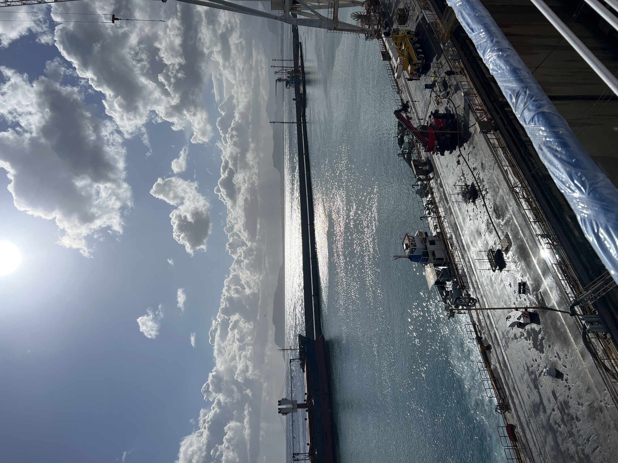 The image displays a daytime scene at the Port of Palermo, Italy, under a partly cloudy sky with bright sunlight causing significant glare on the water. The central and left portions of the frame show blue-green water with strong reflections. A large, dark-hulled cargo ship, bearing a partial name resembling "PLATON," is visible in the water on the left side. Beyond this ship, a long concrete breakwater or pier extends horizontally across the mid-ground. Distant mountainous landforms are present on the horizon. The right side of the image features a concrete dock or shipyard quay. On the dock, a yellow multi-axle mobile crane truck and a red mobile crane are positioned. A small white and blue tugboat is moored at the quay. Several dark-clad figures, presumed to be workers, are visible near the machinery. The dock surface shows areas of wetness and various industrial objects, including pipes and structural elements. A large, white gantry crane structure is partially visible on the far right. A blue, plastic-wrapped handrail from the vantage point occupies the immediate lower right foreground.