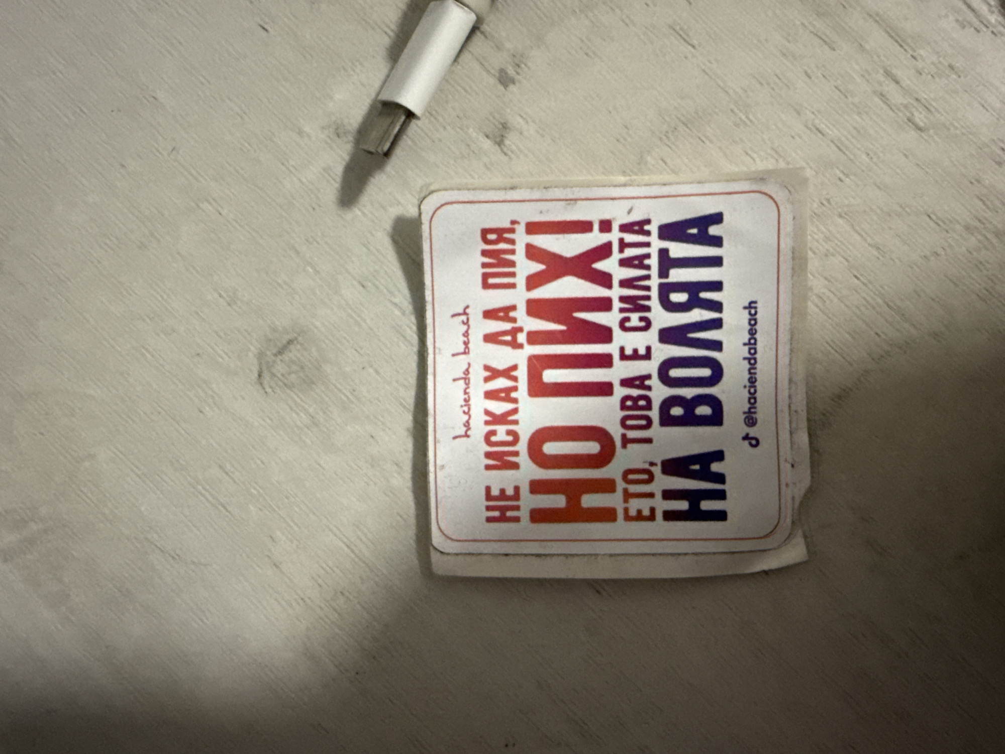 A photograph shows a square sticker with rounded corners placed on a light gray surface. The sticker has a white background with a red border. Text in Bulgarian is printed on the sticker in different colors and sizes. From top to bottom, the text is: "hacienda beach", "НЕ ИСКАХ ДА ПИЯ," in black, "НО ПИХ!" in red, "ЕТО, ТОВА Е СИЛАТА" in black, "НА ВОЛЯТА" in blue, and "@haciendabeach" in black. A white cable is partially visible in the upper left corner of the image. The exact location in Sofia, Bulgaria, cannot be determined from this image.