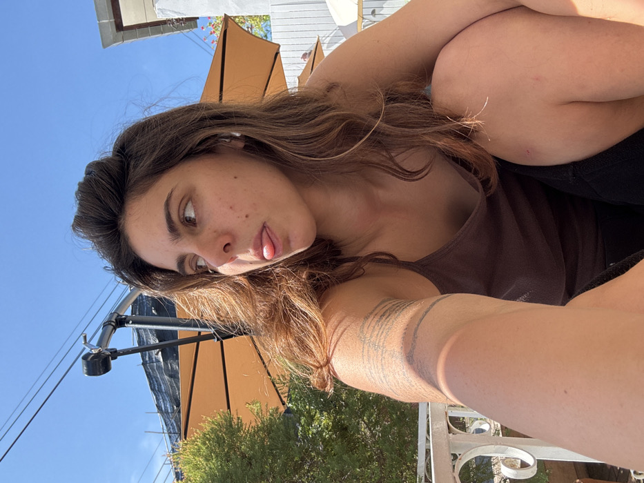 A woman poses for a selfie outdoors. She wears a brown tank top and has brown hair. Her arm, adorned with a dark, linear tattoo, is extended toward the camera. Her face is turned slightly to the side, her tongue playfully sticking out. In the background, there's a blue sky, a partially visible brown umbrella, a green bush, and architectural elements like a railing and power lines.
