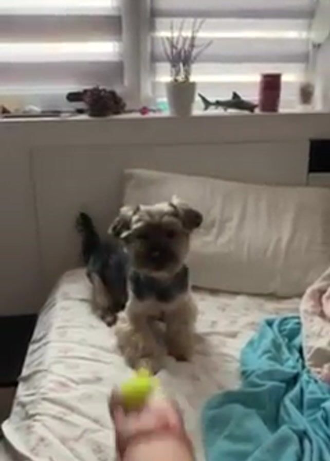 person playing fetch with a small dog on a bed. The person holds up a tennis ball, and the dog, a small breed with gray and tan fur, jumps up on its hind legs and then grabs the ball. The dog then settles down on the bed next to a blue blanket, holding the tennis ball in its mouth. The bed has a white headboard and a patterned bedspread. A window with blinds is visible in the background, along with a few decorative items like a plant, a shark figure, and a can.