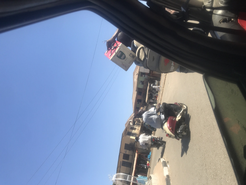 From inside a car, a view of a busy street scene unfolds. Two men on motorcycles are visible. One carries a boxed item with red accents. A backpack with "HP" on it rests on the back of a seat. Buildings line the street, showing storefronts and activity. The sky is bright and blue, crossed by electrical wires. The scene appears to be taken on a clear, sunny day.