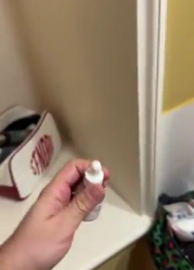 A person places a small bottle with a dropper on a shelf. The person then takes the bottle and, looking into a mirror, applies the liquid to their face. The setting is a bathroom.
