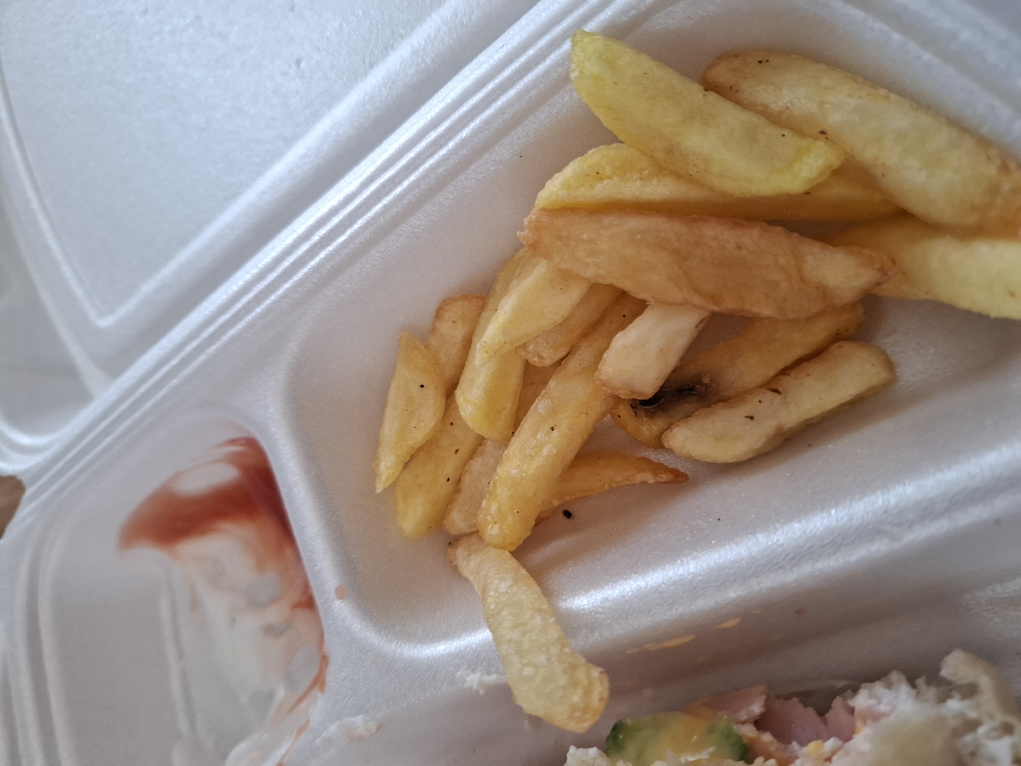 The image presents a close-up, top-down view of food items contained within a white, multi-compartment styrofoam takeout container. In the upper-left compartment, residual red sauce, consistent with ketchup, is smeared on the bottom and side, with a translucent plastic fragment partially submerged in it. The central compartment is occupied by numerous golden-yellow french fries, varying in length and displaying occasional dark specks, indicative of seasoning or minor charring. A portion of a food item, possibly a sandwich or wrap, is visible in the lower-left corner, revealing a white bread-like exterior, pink processed meat (e.g., ham), and slices of green avocado. The scene is located in Panagyurishte, Bulgaria. No individuals or specific actions are depicted.