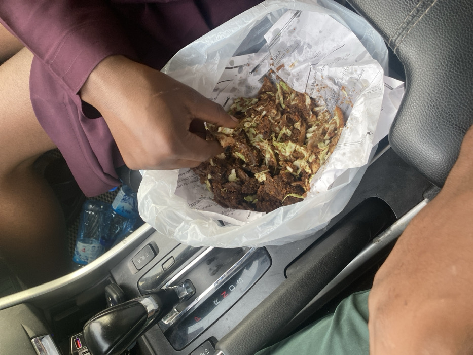 Inside a car, a person in a maroon shirt reaches into a plastic bag filled with food. The food, resting on newspaper, appears to be a dark, fried dish mixed with light green cabbage. The plastic bag is placed on the center console near the gear shift. Water bottles are seen under the passenger's legs. Another person, wearing green pants, is partially visible in the shot.