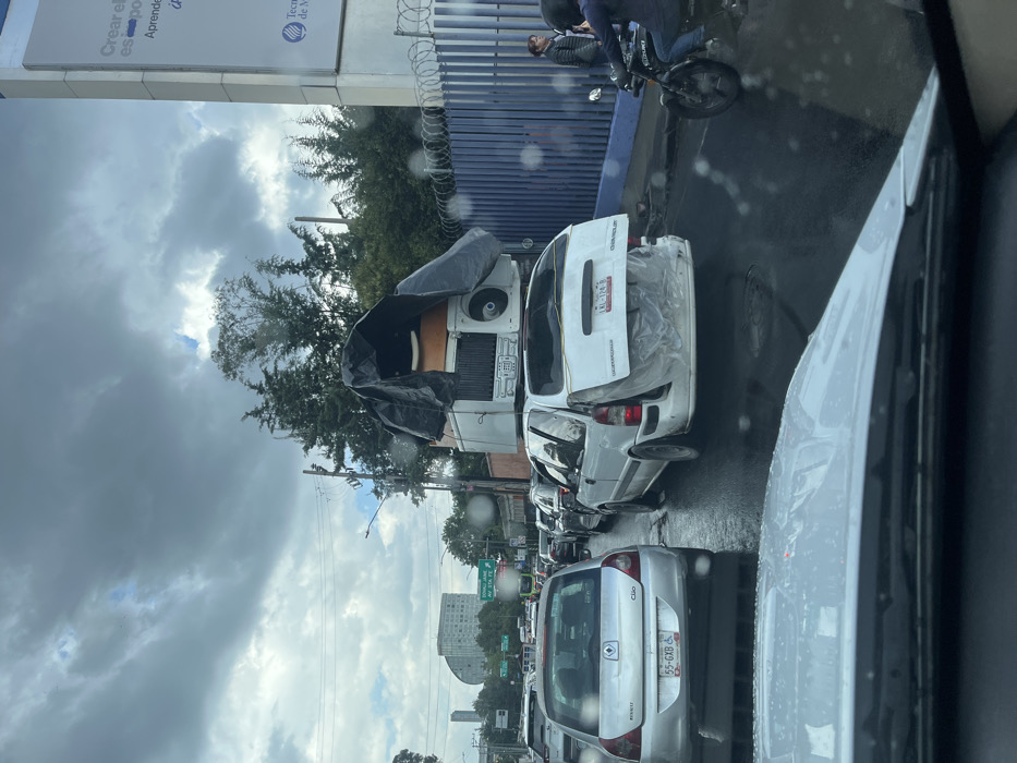 This image depicts a congested urban street scene in Mexico City, Mexico, specifically near Avenida Santa Fe, evidenced by a visible street sign reading "AV STA FE" and a large billboard partially displaying "Tecnología de México," likely associated with a "Tecnológico" institution in the Santa Fe district. The weather is overcast with heavy clouds, and the asphalt road is wet, suggesting recent rain. In the mid-ground, a white Chevrolet Corsa-style wagon with Mexican license plate AAL-124-B is prominently featured. Its rear tailgate is open or missing, with a large transparent plastic sheet covering the opening, and the rear bumper appears damaged. The vehicle is heavily overloaded, carrying a large white air conditioning outdoor unit on its roof, surmounted by another bulky, rectangular object, both largely covered by a black tarp and secured with visible yellow straps. Immediately in front of the viewer's vehicle is a silver Renault Clio with Mexican license plate 55-GXB-A. Numerous other vehicles are visible in a queue extending into the distance, indicating traffic congestion. To the right of the white wagon, a person on a black Suzuki motorcycle, wearing a dark jacket and helmet, navigates alongside the stationary traffic. On the right side of the road, a tall blue metal fence topped with razor wire separates the street from a property. Adjacent to this fence, two pedestrians are visible; one woman in a dark jacket stands facing left. Utility poles and overhead wires are present along the street. In the distant background, modern high-rise buildings are visible beneath the cloudy sky. The image is captured from inside a vehicle, with raindrops visible on the windshield.