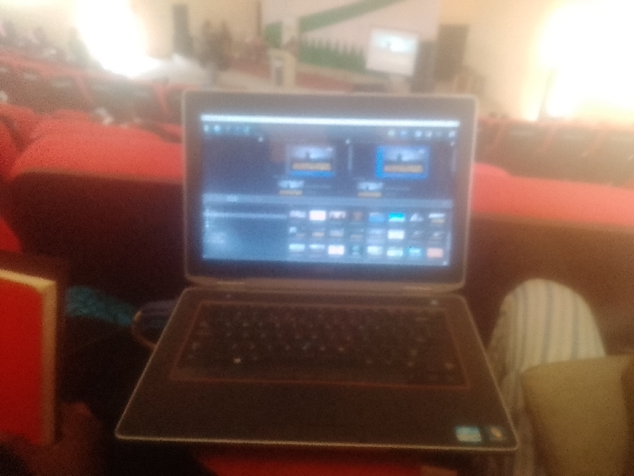The image displays a severely out-of-focus and overexposed interior scene. A silver-framed laptop with a black keyboard is centrally positioned, open, and powered on. Its screen shows what appears to be video editing or presentation software with multiple graphical elements, including at least two larger video preview panes. A faded operating system logo sticker is visible on the laptop's palm rest. To the left of the laptop, a portion of a red-covered book is visible. To the right, the lower leg of an individual wearing light-colored, vertically striped pants is partially visible. The laptop rests in front of multiple rows of red upholstered seating, extending into the midground and background, typical of an auditorium or large conference room. Indistinct human figures are faintly discernible in some of the distant seats. A stage or presentation area is suggested in the far background, featuring a blurred white screen or projection surface and a banner with green and white elements. Bright light sources dominate the upper right background, contributing to the image's significant overexposure. The location is an auditorium, lecture hall, or large conference room in the city of Unknown, Unknown.