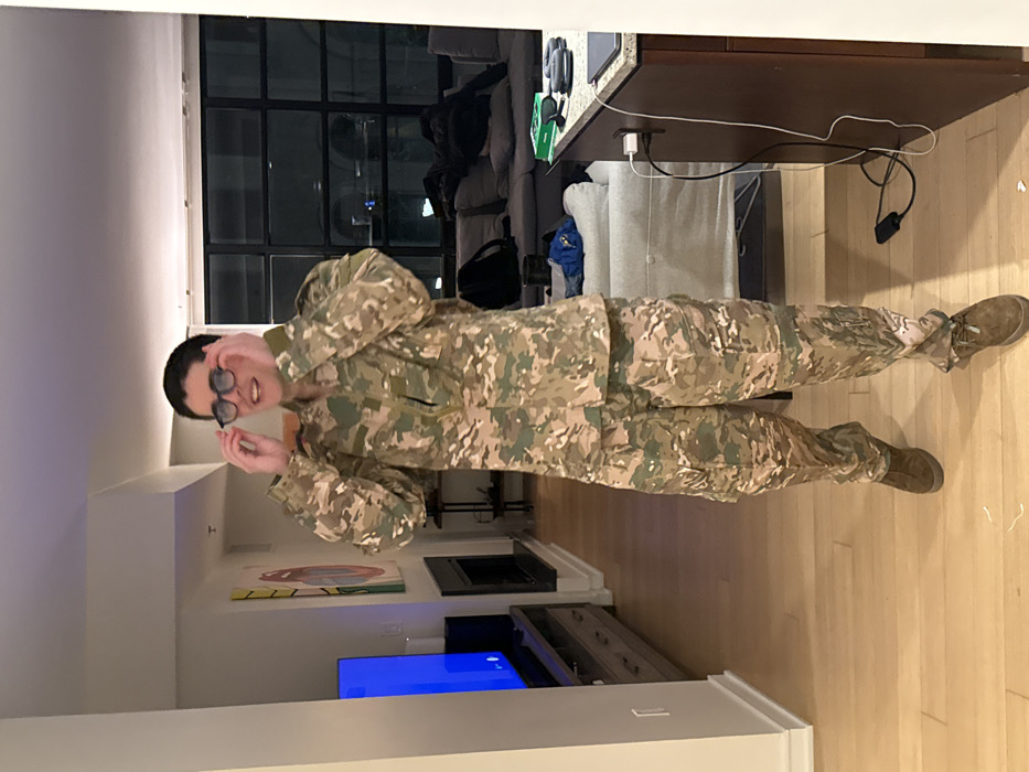 A male individual, with short dark hair and wearing dark-framed eyeglasses, stands centrally in a residential interior, looking slightly right with a smiling expression while holding his glasses with both hands. He is dressed in a full multi-terrain camouflage uniform, comprising a long-sleeved shirt and cargo pants, paired with brown suede-like lace-up shoes. The room features light-toned hardwood flooring and white baseboards. To the left, a wall-mounted television displaying a blue screen rests on a multi-drawer wooden media console, adjacent to a recessed fireplace beneath a piece of modern art depicting stylized red lips on a yellow background. To the right, a large window with dark frames shows a dark urban night scene with distant lights. A grey sectional sofa, partially draped with dark clothing, and a dark backpack are situated near the window. In the foreground right, a dark kitchen island with a light countertop holds a tablet, a small green box, and other electronic devices, with charging cables extending from power outlets on its side. This scene is located in Boston, United States.