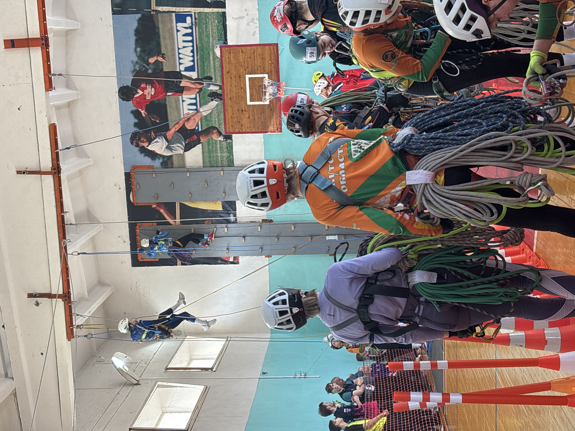 The image depicts an indoor sports facility, likely a gymnasium, configured for rope-based technical activities, located within the city of Tayshet, Russia. The environment features light blue and beige painted walls, a light brown polished floor, and a white ceiling with exposed structural elements and lighting fixtures. Large rectangular windows with mesh are visible on the left wall. A prominent mural on the back wall illustrates two soccer players in action, with the partial text 'WATTYL' visible, and a basketball hoop with a wooden backboard is mounted below it. Orange horizontal steel beams serve as anchor points high on the ceiling, from which multiple ropes extend. A vertical climbing structure is positioned on the right side of the mural. Approximately 15-20 individuals are present. In the upper left, one person, wearing a blue and black suit, white helmet, and harness, is suspended by ropes, appearing to rappel or be lowered. Another person, dressed in a blue and yellow patterned suit with a white helmet, is actively ascending or descending the vertical climbing structure on the right. In the foreground and mid-ground, several participants are seen preparing or managing equipment. They wear helmets (white, grey, orange, red, green, black) and harnesses over various colored technical clothing (orange, green, purple, black). Coiled ropes in green, grey, and blue are attached to their harnesses. Some helmets bear identification numbers, such as '59'. One individual in the immediate foreground, facing away, wears a purple long-sleeved top, grey pants, a white and grey helmet, and a black harness laden with green ropes. To their right, another individual, also facing away, wears an orange and green patterned long-sleeved top (with partial Russian text "ОБЛАСТИ"), a white and orange helmet, and a harness with grey and blue ropes. On the left side of the scene, behind an orange and yellow mesh barrier delineated by orange and white traffic cones, a group of individuals in casual attire observes the ongoing activities.