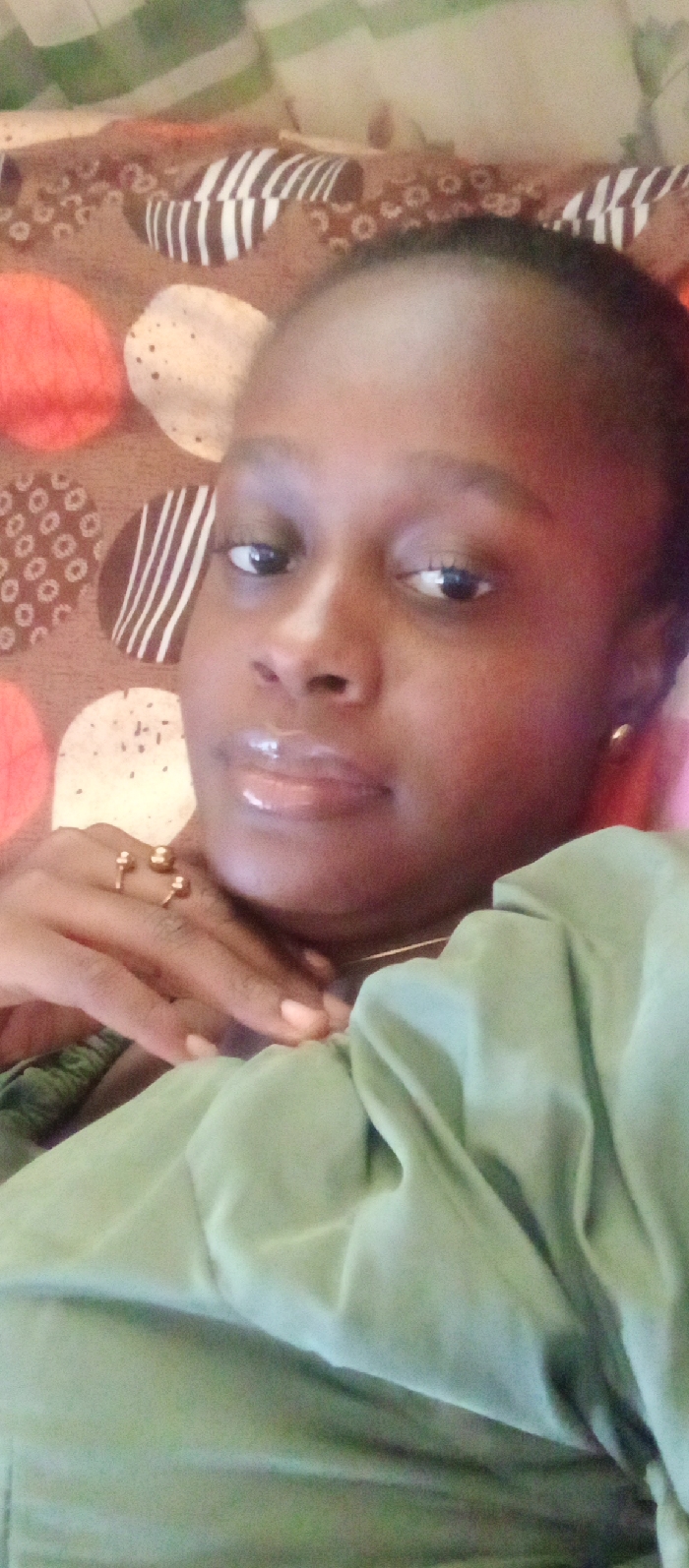 A close-up image depicts an individual, appearing to be female, with dark skin, positioned indoors. The subject is partially reclining, with the upper torso and head visible. They are wearing a light green garment. The left hand is resting against the neck and jawline, adorned with two gold-colored rings on the fourth finger. A thin gold-colored necklace is visible. The subject has dark hair pulled back, dark eyes, and full, glossy lips; their gaze is directed slightly to the viewer's right. A small gold-colored earring is present on the right earlobe. The background consists of a patterned fabric, likely bedding, featuring circular and oval motifs in shades of brown, white, and orange-red, some with internal patterns like dots or stripes. The exact location within Akwanga, Nigeria, cannot be determined from the visual information provided; the scene appears to be a private interior space.